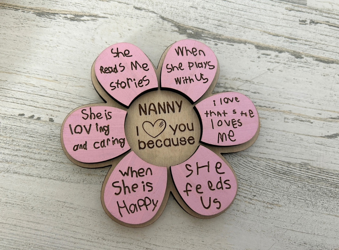 - You can send the messages and name written in your child's handwriting. We will then trace the handwriting and that is what will be engraved into the petals. If you choose this option please make sure to take the picture with plenty of light and the words are dark enough so they can easily be read. You will then upload that when you order. You will need to label each petal so the messages are clear (ex. Petal 1 - because you are sweet, etc.). You will then need to write the name and I/We Love you because etc.