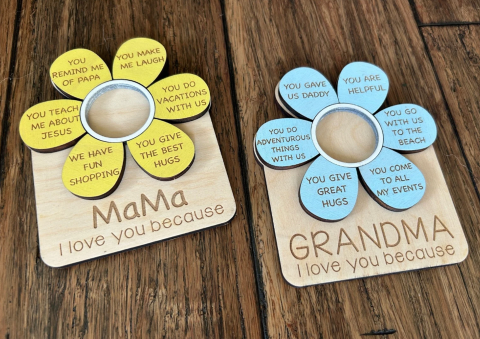 Each flower is laser-cut and engraved with your custom name in the center, surrounded by 6 petals filled with loving messages directly from the kids.