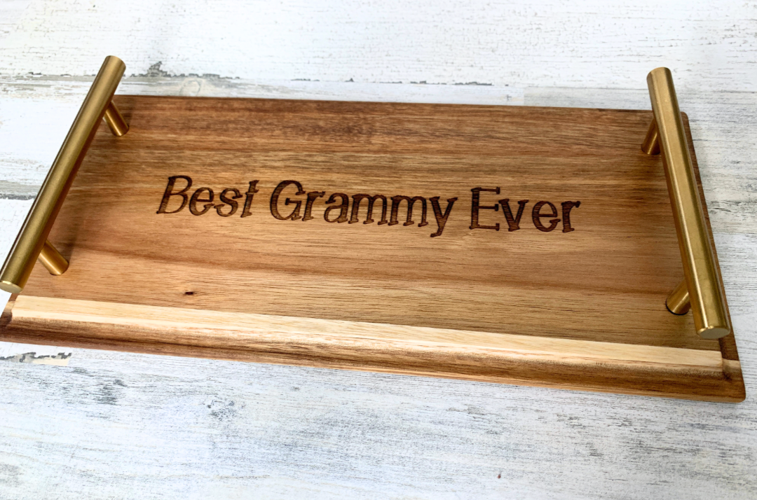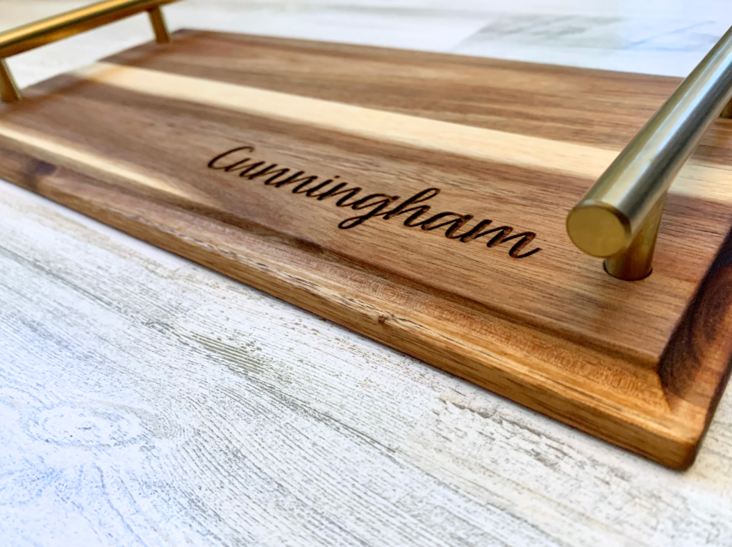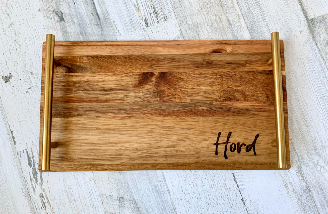 Elevate your entertaining game with this beautifully handcrafted acacia wood tray, engraved with the name, saying or monogram of your choice. Featuring sleek brass handles and acacia wood, this tray is as functional as it is stunning. Whether you're serving guests, gifting a newlywed couple, or adding a personalized touch to your home decor, this tray is a timeless piece they’ll treasure forever.