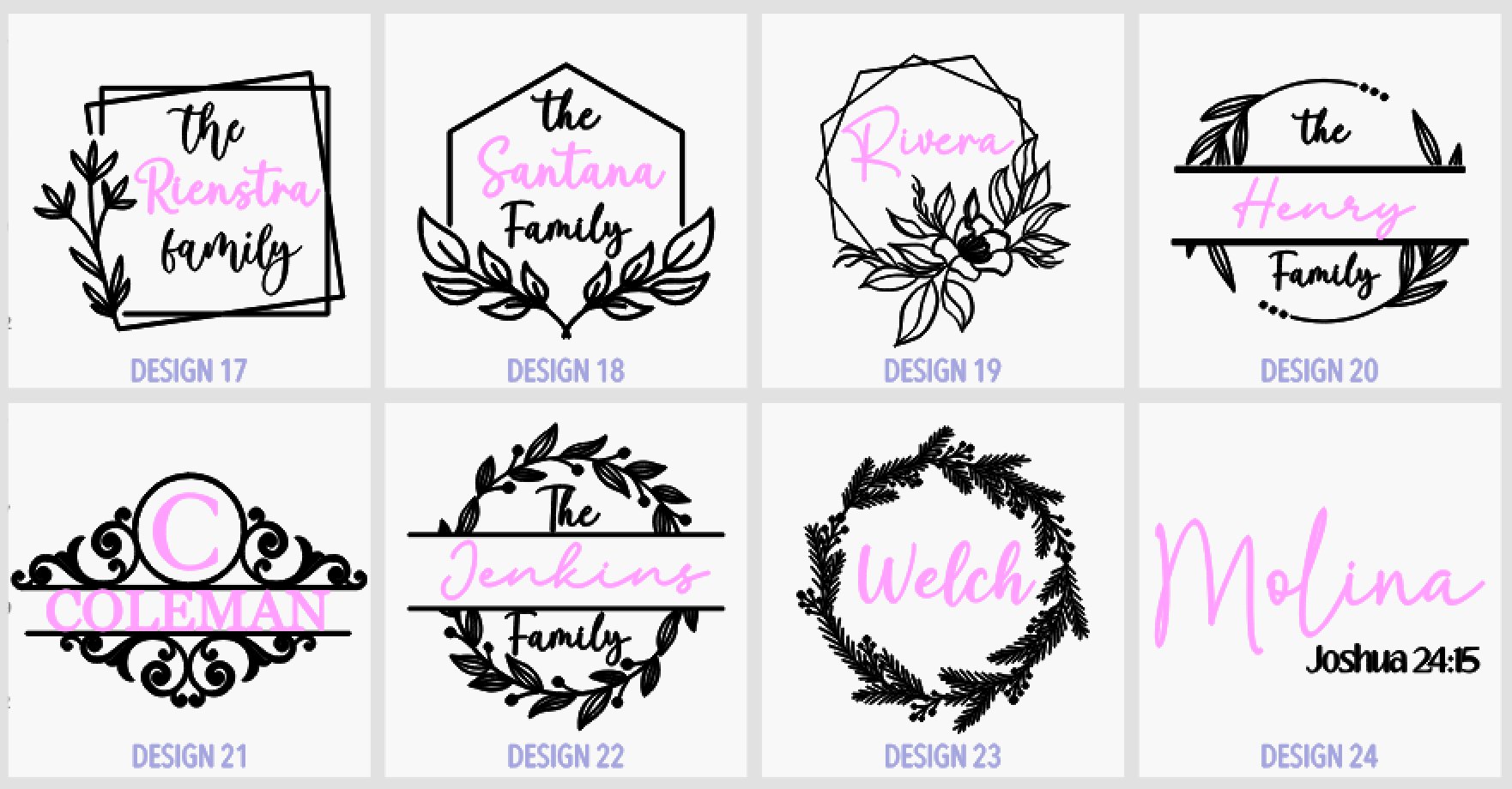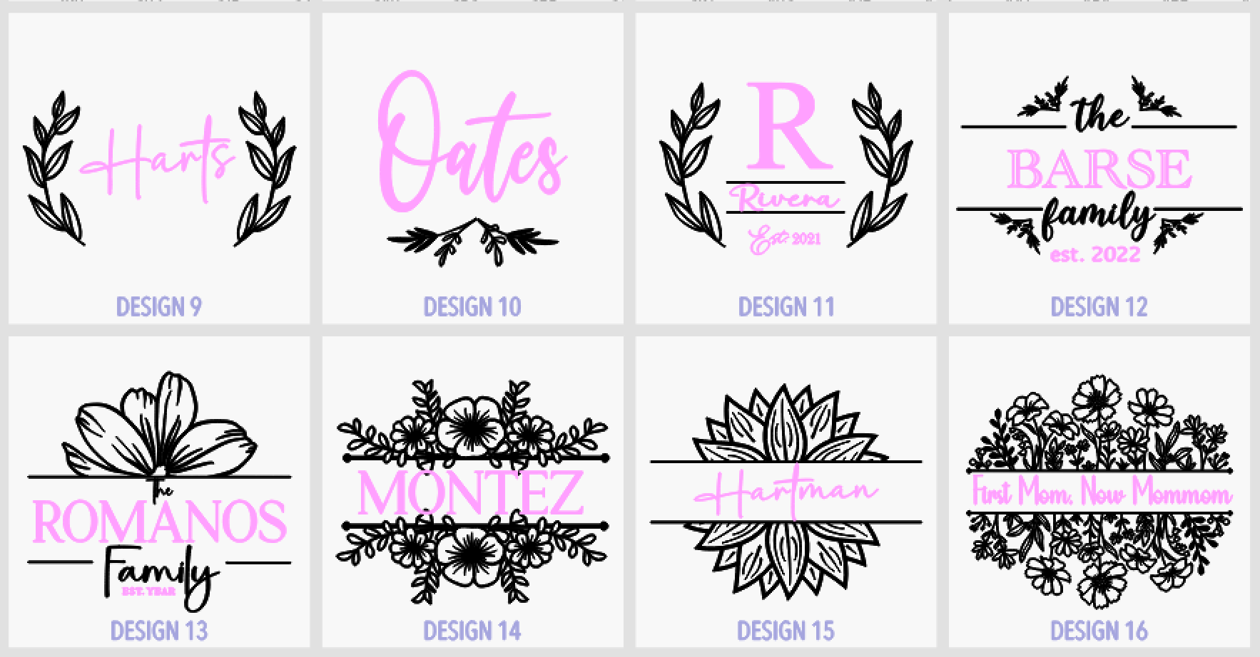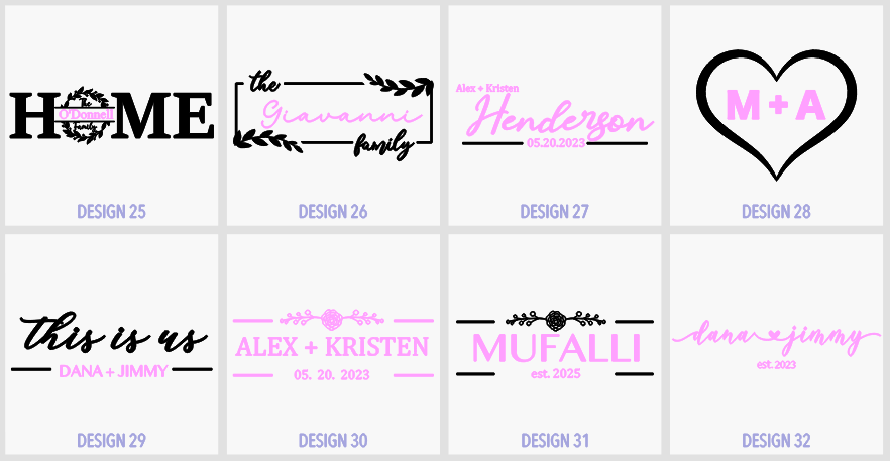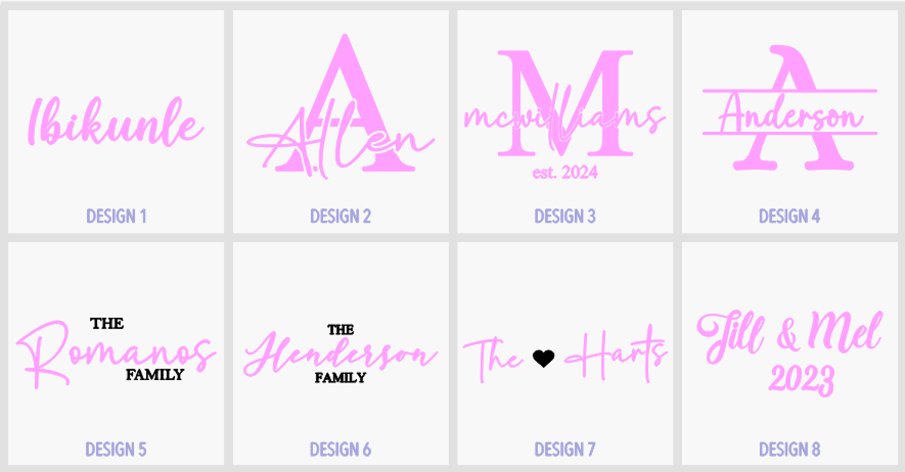 You will choose from the different design options. You can write the name or saying in the space and select your font. If you choose a design with initials please write (M+K or M&A etc). If you choose a design with a name and letter corresponding to that name (ex. design 2), the letter will be the first letter of the name as shown in the example designs. if you choose a year or date please write EXACTLY what you want (2023, EST. 2023, 05/12/23 etc)