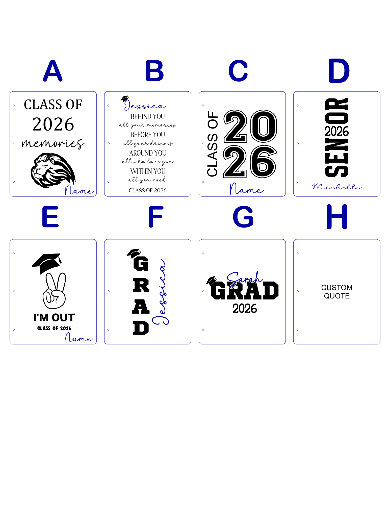 Choose from multiple laser engraved designs. Areas in BLUE are customizable. You can choose to not have that element on your item. For names you will use the font tool to fully personalize your design.